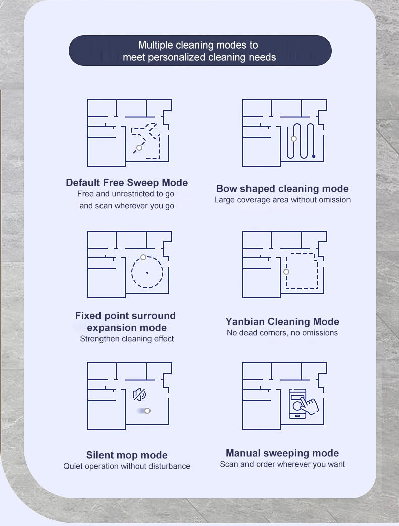 6. Six cleaning modes to meet cleaning needs. Free sweeping; Bow shaped cleaning; Third: Fixed point surround expansion cleaning; Fourth: Yanbian cleaning; Fifth: mopping mode; Sixth: Manual cleaning