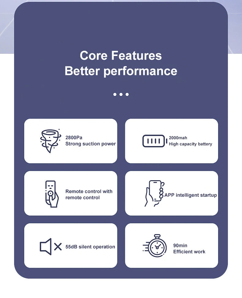 1.2800pa powerful suction, 2000mAH large capacity battery, remote control operation, APP intelligent start, 55 dB silent operation, charging for 3-4 hours, efficient operation in 90 minutes