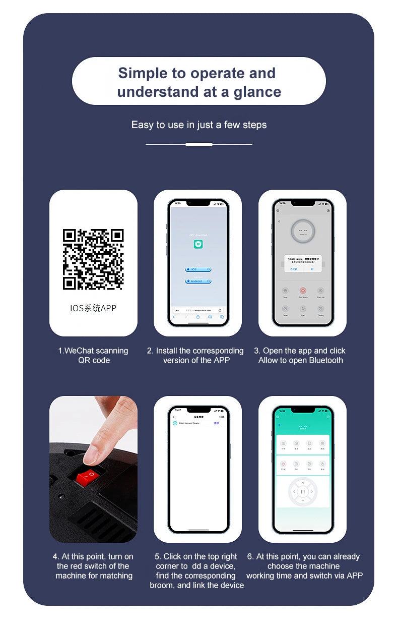 4: APP operation instructions: 1: WeChat QR code scanning; 2. Install the corresponding version of the app; 3. Open the app and click Allow to open Bluetooth; 4. At this point, turn on the red switch of the machine for matching; 5. Click on the top right corner to add a device, find the corresponding broom, and connect the device; At this point, the machine's working time and switches can be selected through the APP