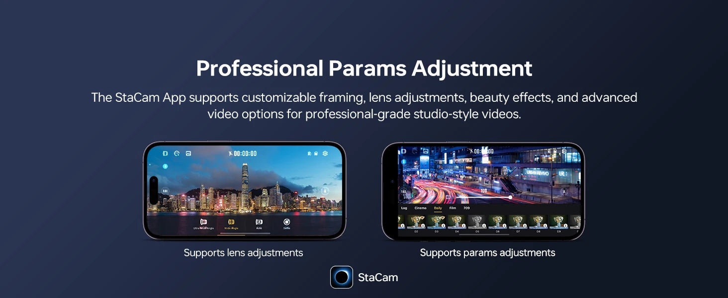 The StaCam App supports customizable framing, lens adjustments, beauty effects, and advanced video options for professional-grade studio-style videos. SMOOTH 5S AI Tracking Handheld Stabilizer 3-Axis Smartphone Gimbal Outdoor Gimbals Pro-Level Stability