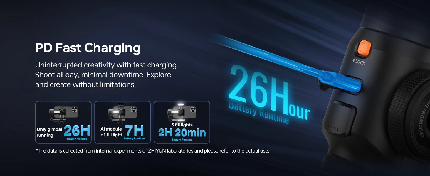 Uninterrupted creativity with fast charging Shoot all day, minimal downtime. Explore and create without limitations. SMOOTH 5S AI Tracking Handheld Stabilizer 3-Axis Smartphone Gimbal Outdoor Gimbals 360° Rotation