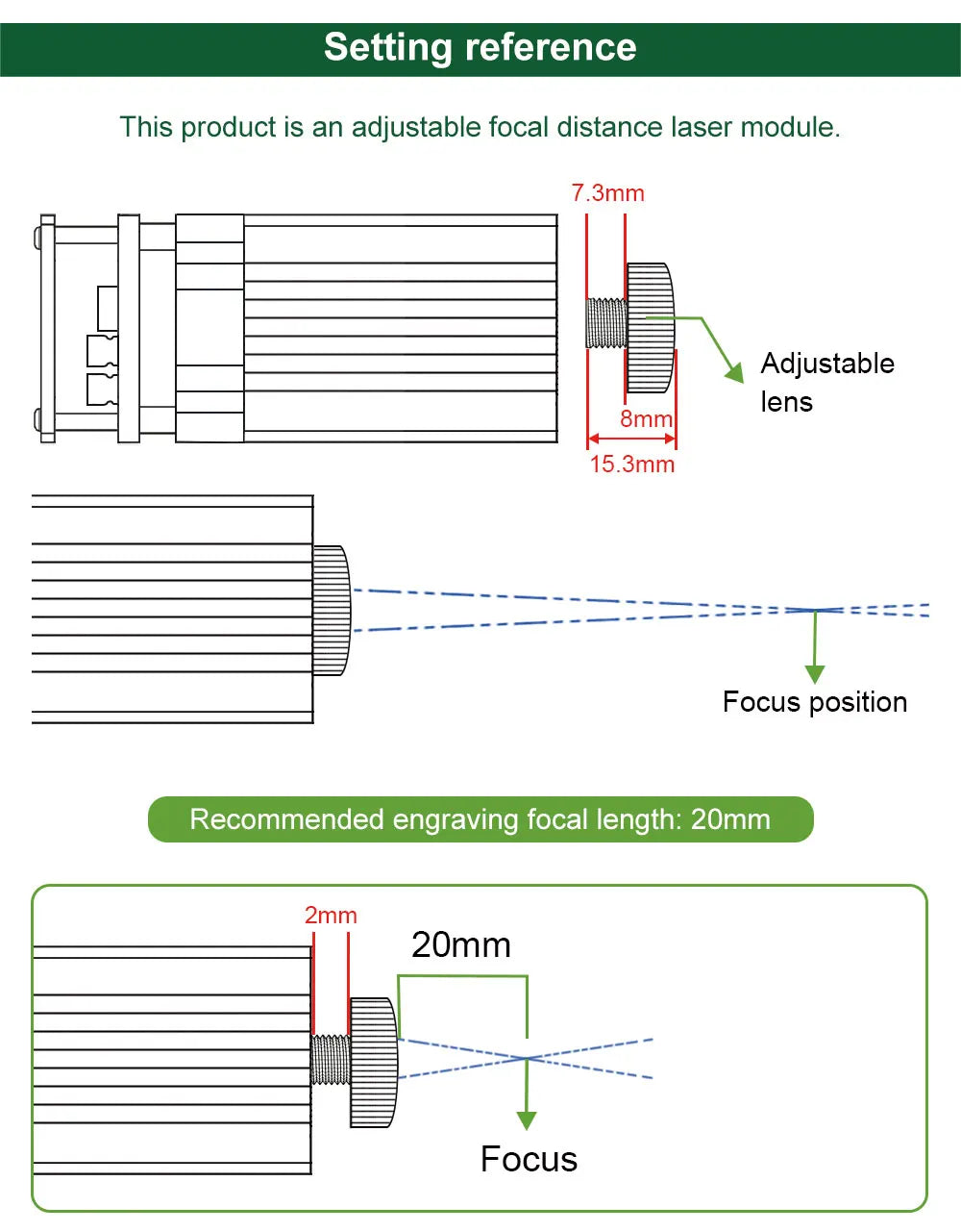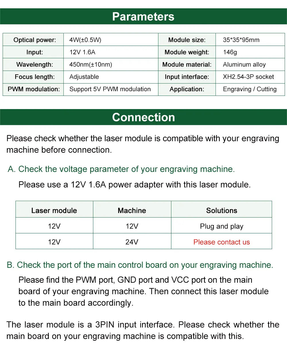 Wavelength: 450nm; Input: DC 12V 1.8A(1.5A-2A); Power adjustable: Support 5V PWM modulation; Input port: XH2.54-3P socket; control line installation method: Pluggable, Adjustable laser head, easy to adjust, connection is convenient; suitable for DIY engraving machine. And excellent compatibility with most other brands engraver machine, CNC router and 3D printers machine.