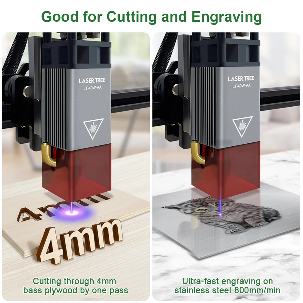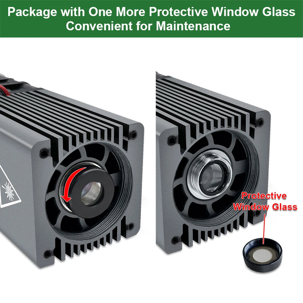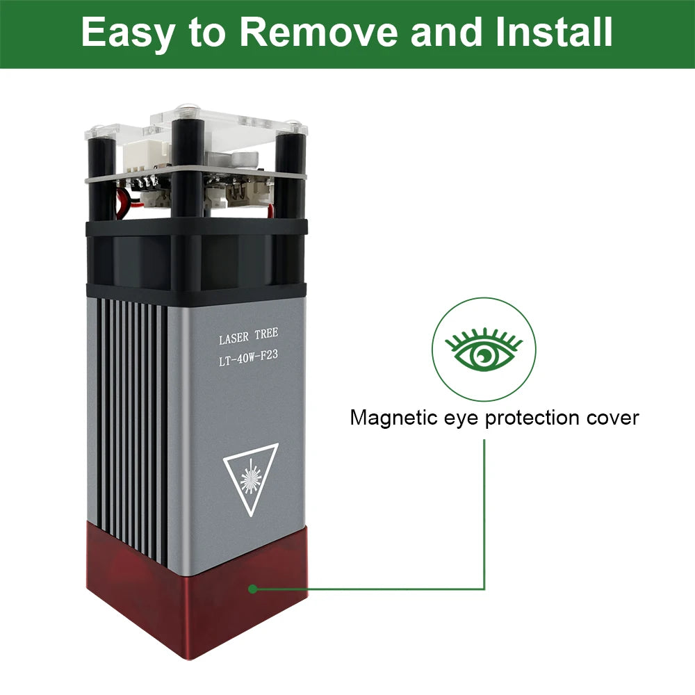 The 40W laser engraving head with metal wind gathering hood,prevent flames from burning. Upgraded Magnetic eye protective cover, easy to remove and install. Control line installation method: pluggable. suitable for DIY engraving and cutting machine.