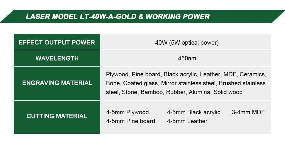 Plywood, black acrylic, MDF, wood, paper, leather, bamboo, plastic, rubber, alumina, stainless steel, etc. (Unable to engrave: blue/purple/white/transparent material, aluminum without oxide layer)